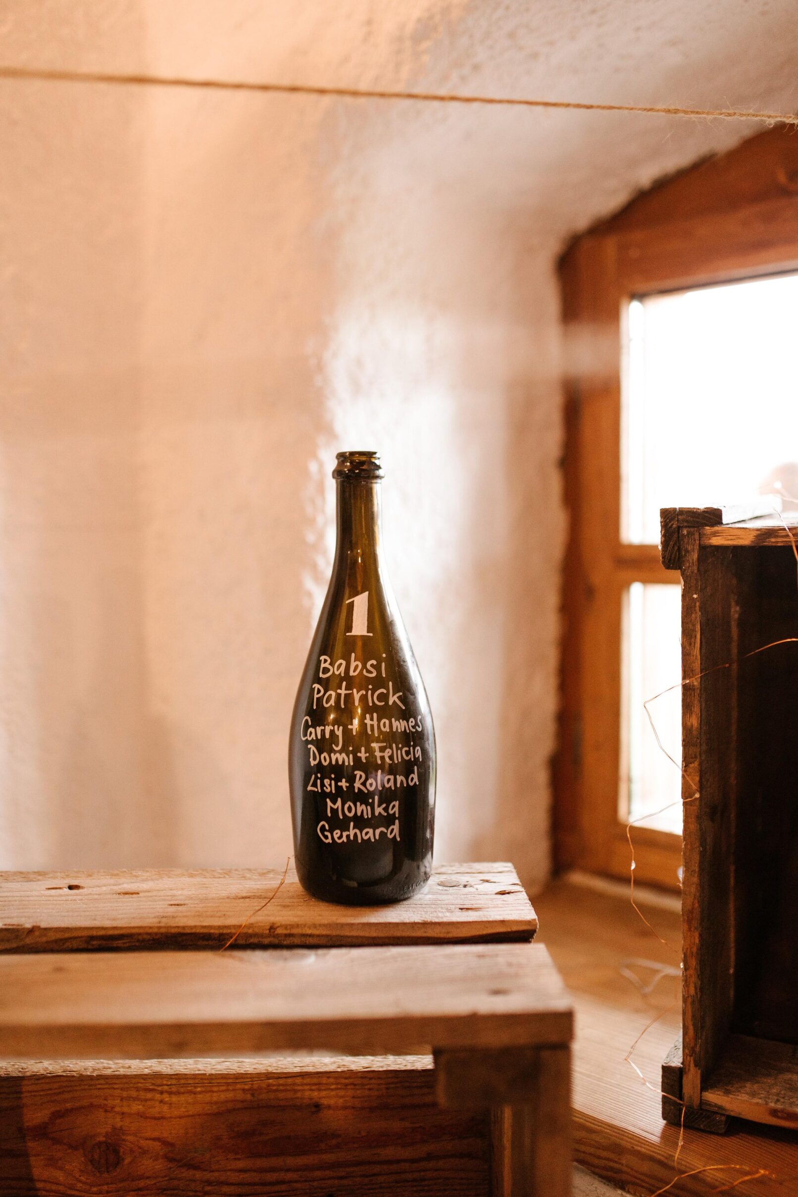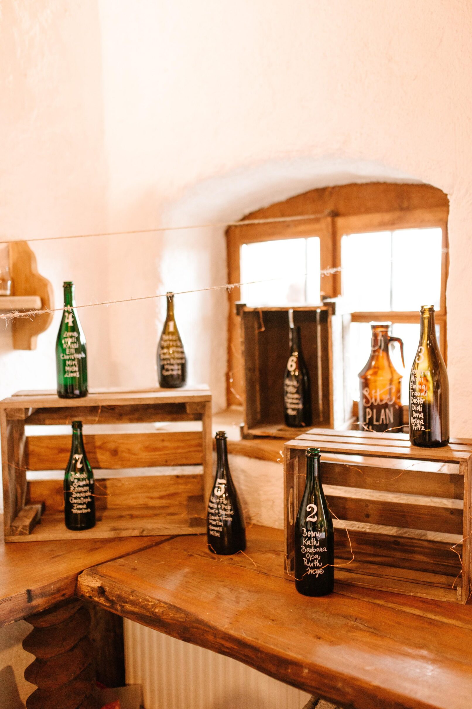 A special highlight of the project was the seating chart, which I hand-lettered directly onto a curated selection of wine bottles. This approach added a personal, tactile dimension and reinforced the overall theme, blending craftsmanship with the cultural identity of South Styria.