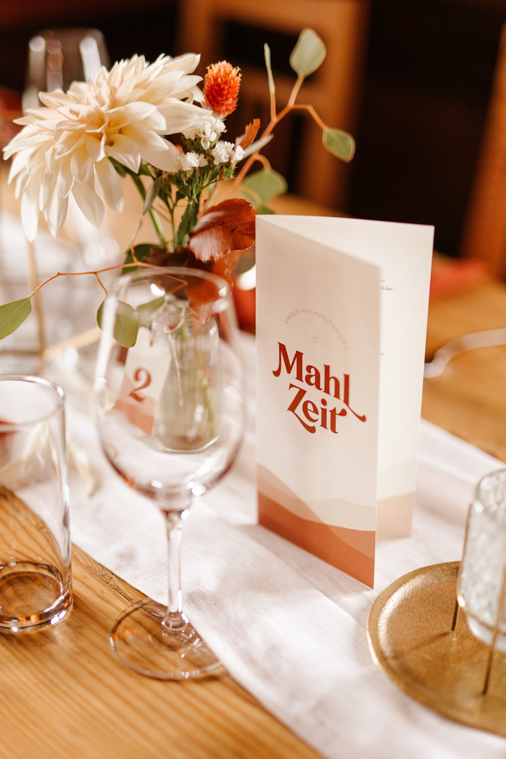 For my wedding, I created a stationery set including menu cards, table cards, and additional printed elements. The design is inspired by the colors of autumn, featuring warm reds and earthy tones, combined with subtle silhouettes of the South Styrian vineyards.